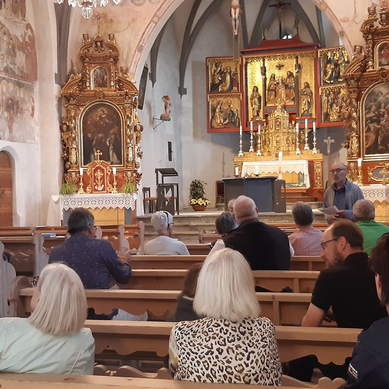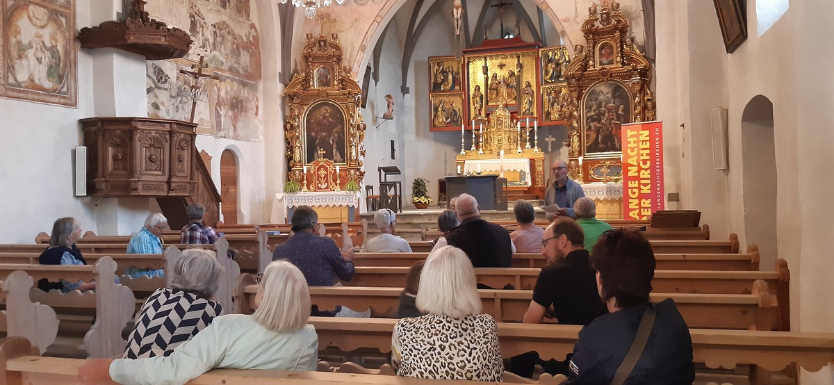 Die Lange Nacht der Kirchen fand in und zwischen den beiden Kirchen von Tomils und Scheid statt. Der ökumenische Anlass begann in der Katholischen Kirche Tomils und endete in der Reformierten Kirche Scheid. Wer mochte, konnte den Weg von Tomils nach Scheid wandernd in der Gruppe unter die Füsse nehmen. Für alle anderen stand eine Transportmöglichkeit zur Vergütung.