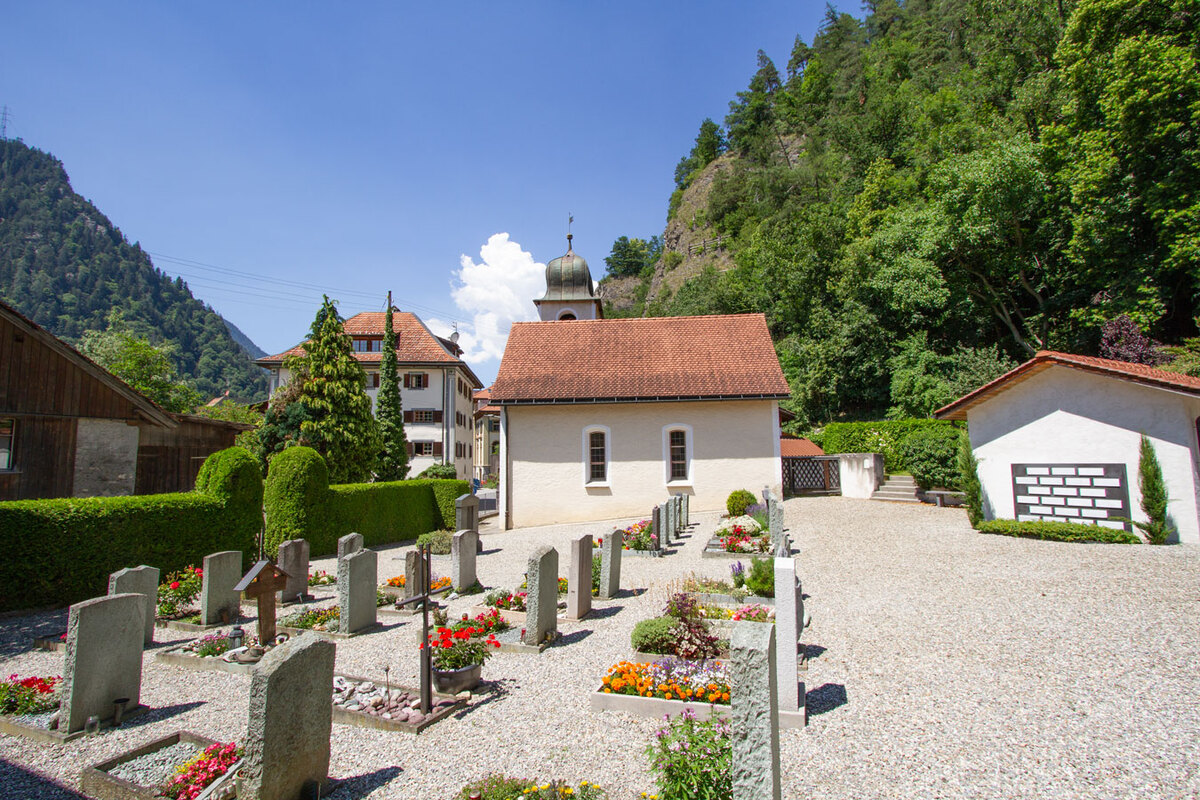 Auf dem Friedhof direkt am Felsen bei der Kirche liegen die Gräber der Adelsgeschlechter von Schloss Ortenstein.